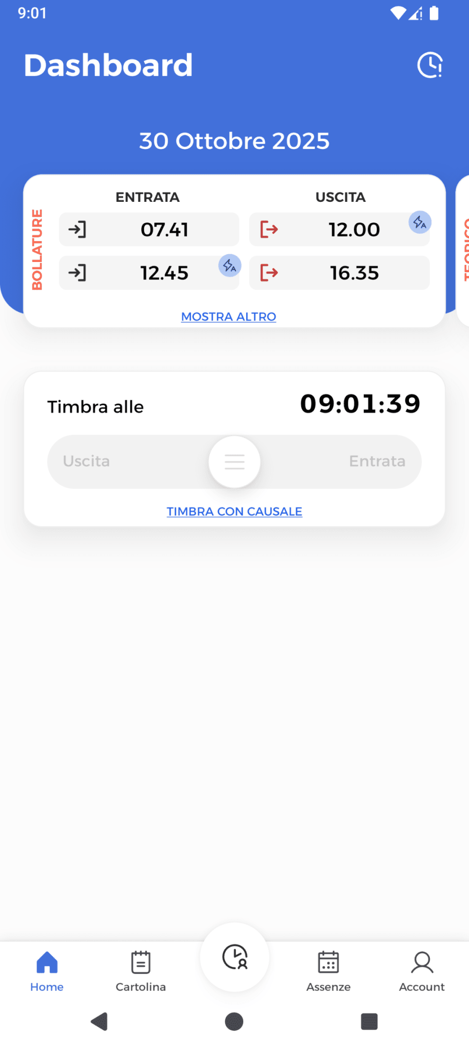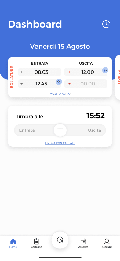 I dipendenti bollano con un tap tramite l’app, e voi tracciate con precisione non solo Entrata/Uscita, ma anche intervalli, pause e assenze a ore. Ottenete un dettaglio esatto e verificato delle ore lavorate, eliminando le contestazioni