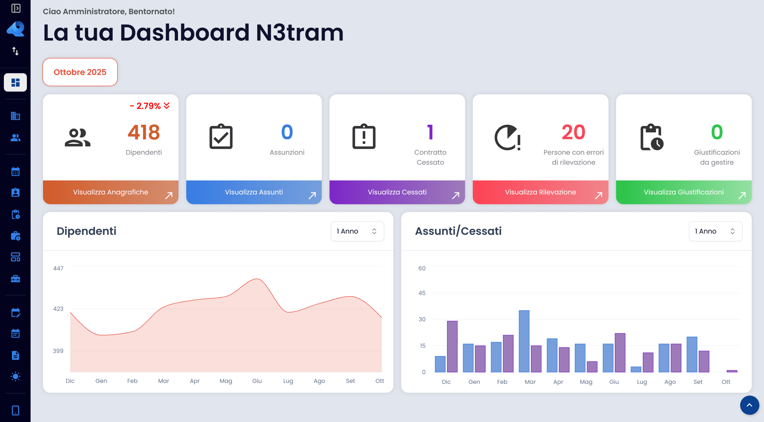 La Dashboard centralizza tutti i dati HR vitali: numero di dipendenti, assunzioni e cessazioni nel mese, gli errori di rilevazione e le giustificazioni in attesa di approvazione. Basta un’unica schermata per avere una visione strategica, senza perdere tempo a incrociare i dati.